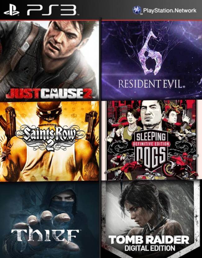 6 juegos en 1 Thief mas Saints Row 2 Ultimate Edition mas Edición digital de Sleeping Dogs mas Just Cause 2 Ultimate Edition mas Edición digital de Tomb Raider mas RESIDENT EVIL 6 PS3