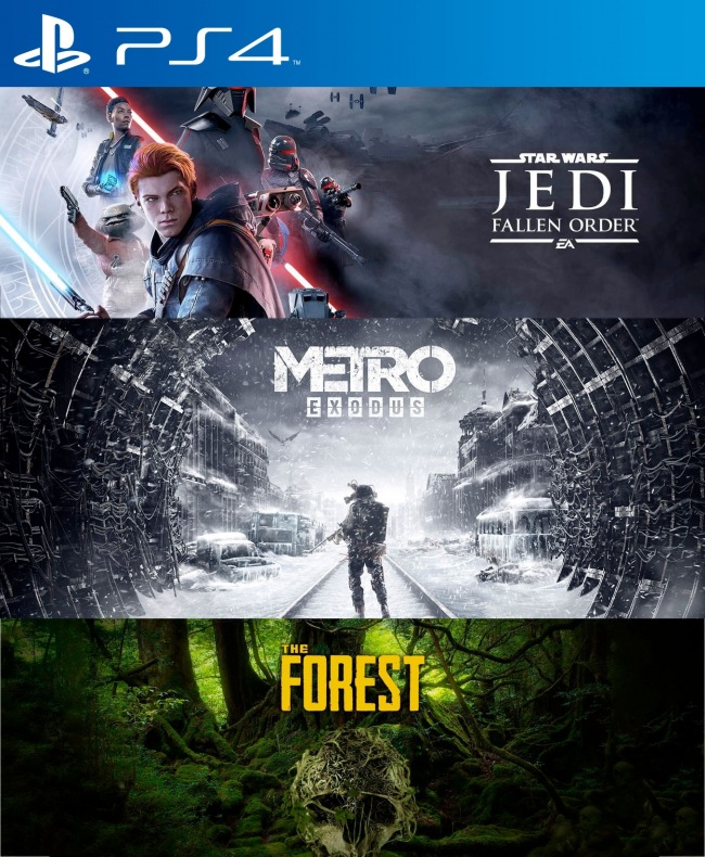 El pack incluye: - STAR WARS Jedi Fallen Order PS4 - METRO EXODUS PS4 - The Forest PS4 Pesos de los juegos : 99 GB Requerido en consola : 110 GB Instalación : 1 consola
